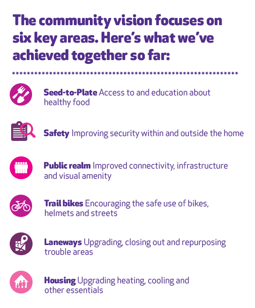 This year marks the halfway point in our community renewal project within the disadvantaged Tasmanian suburbs of Clarendon Vale and Rokeby, east of Hobart.